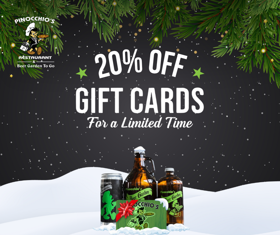 Use code THANKS25 to get 20% off Pinocchio's gift cards through December 5th.